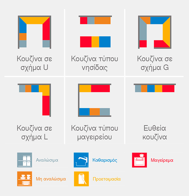 Αν θεωρήσουμε ότι μπορεί ένα γράμμα να περιγράψει την κάτοψη της κουζίνας σας, τα πράγματα γίνονται απλά! Για μια μεγάλη και άνετη κουζίνα, ιδανικό είναι το σχήμα U ή Π καθώς εκτείνεται σε 3 τοίχους και υπάρχουν και περιθώρια για προσθήκη νησίδας στη μέση! Αν η κουζίνα είναι μικρότερη ή και ξεχωριστή από το υπόλοιπο σπίτι, τότε το σχήμα L ή Γ είναι καταλληλότερο γιατί μεγιστοποιεί τον γωνιακό χώρο. Αν βέβαια ο χώρος είναι μικρός ή μακρόστενος, η παράλληλη διάταξη είναι η μόνη επιλογή, οπότε πρέπει να ακολουθήσετε αντίστοιχη σχεδιαστική κατεύθυνση.